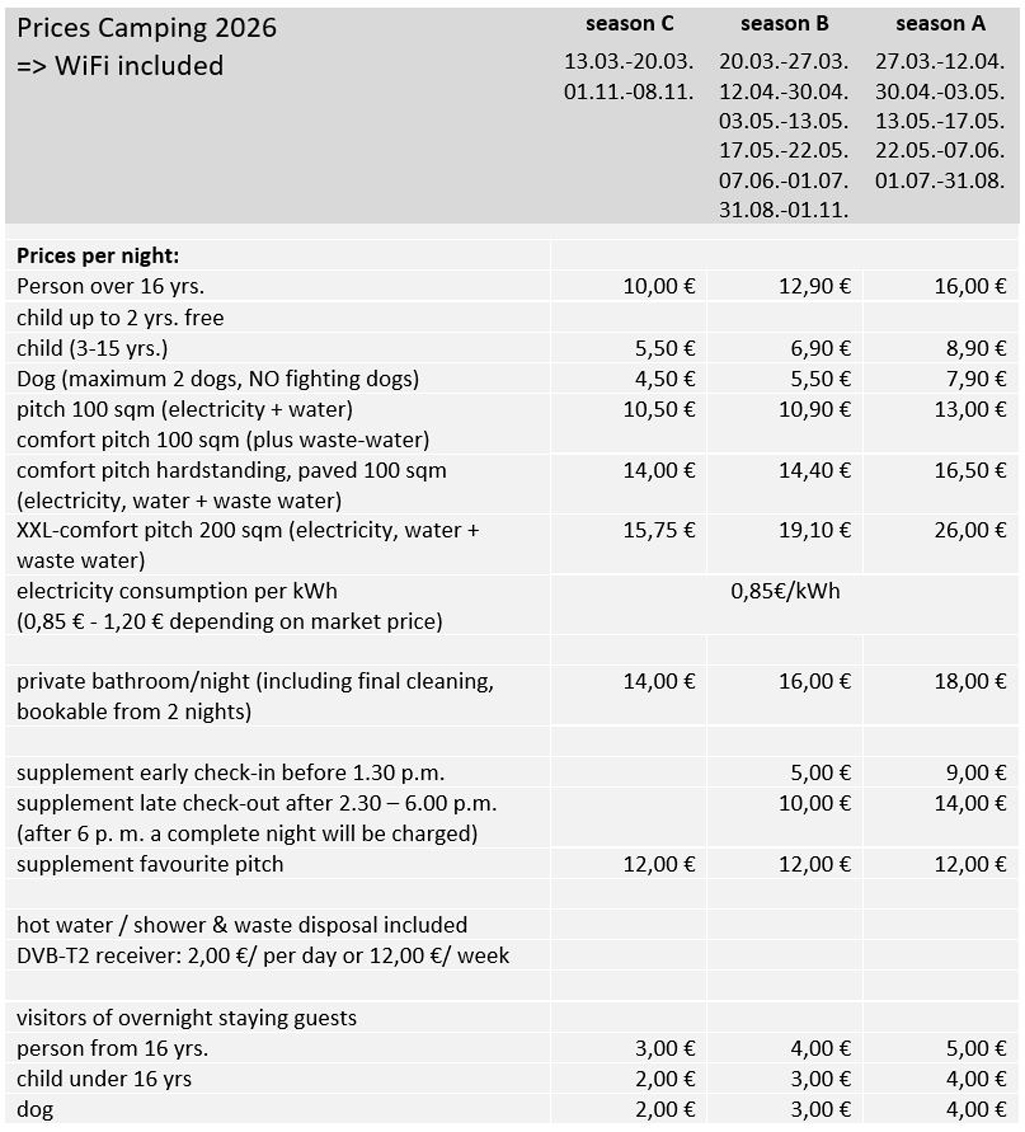 During Easter holidays (02.04.-06.04.26), Ascension holidays (13.05.-17.05.26) & Whitsun (22.05.-25.05.26) and in the main summer season from 17.07.-16.08.26 we will accept reservations for bookings of at least 7 nights. Please ask for shorter overnight stays 6 weeks in advance of those main-holiday-periods. The minimum booking period for pitches during Easter holidays is 02.04.-06.04.26, during Ascension holidays 13.05.-17.05.26 and during Whitsun-weekend 22.05.-25.05.26.