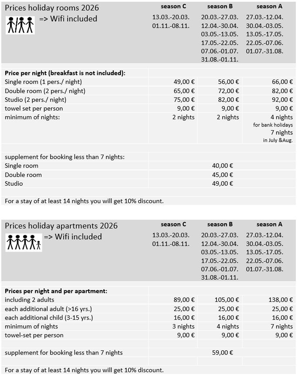 pricelist 2026We are happy to receive your reservation following this link: online reservation. It is the fastest way and we will immediately send you our confirmation. Furthermore it enables a faster check-in at your arrival. Alternatively, please book by telephone, email, or fax. Please be aware that it is not possible to bring pets into our accomodation to rent and that smoking is not allowed in our rentals. For your binding reservation, we will ask for a first installment of 20% of the total rental amount . The accommodation is at your disposal from 3.30 p.m. on arrival day and until 10.00 a.m. on departure day. In our holiday apartments and holiday rooms bed linen is included. We offer towel-sets for 9,00€/person at the reception.