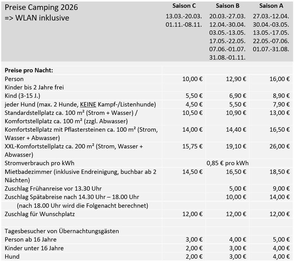 Bei einer Reservierung über das Buchungsformular unserer Website helfen Sie uns, bei Ihrer Anreise eine zügigere Anmeldung zu ermöglichen. Vom 09.11.2025 bis 13.03.2026 hat unser Campingplatz geschlossen.