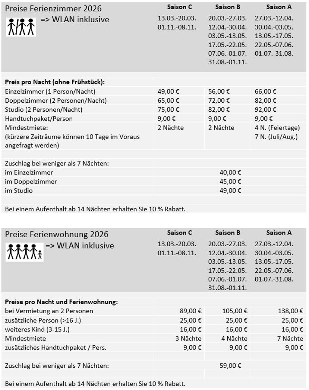 Preise Mietobjekte - Öffnungszeiten: 10.03. - 09.11.2025 & 13.03. - 08.11.2026